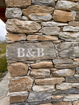 La baita è stata costruita a fianco del punto vendita e caseificio aziendale seguendo le caratteristiche e le regole architettoniche del paesaggio di montagna : pietra a vista, legno e tetto in lose.